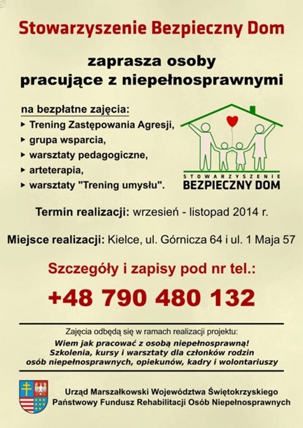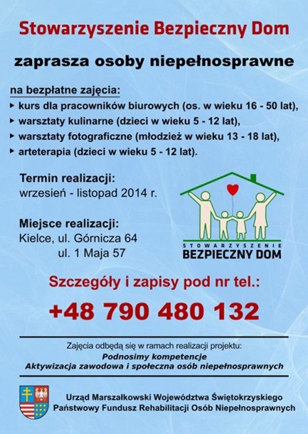 Stowarzyszenie Bezpieczny Dom rozpoczyna realizację projektów finansowanych ze środków Państwowego Funduszu Rehabilitacji Osób Niepełnosprawnych. Pierwszy projekt – „Podnosimy kompetencje. Aktywizacja zawodowa i społeczna osób niepełnosprawnych” – skierowany jest do osób niepełnosprawnych w wieku od 5 do 50 lat i przewidziane są w nim następujące zajęcia: